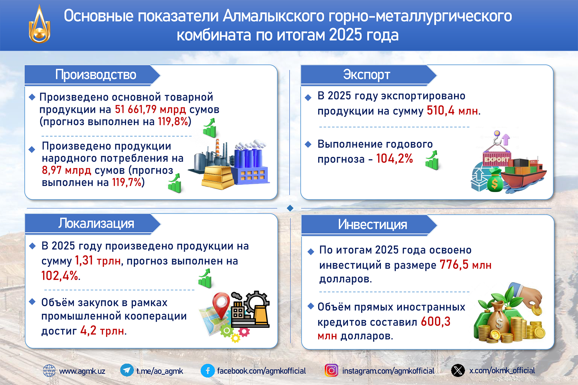 +998 71 619 23 33Ijtimoiy-iqtisodiy rivojlantirish dasturining eng muhim ustuvor yoʻnalishlarini bajarish davomida “Olmaliq KMK” AJ jamoasi 2025-yil yakunlari boʻyicha quyidagi ishlab chiqarish koʻrsatkichlariga erishdi: