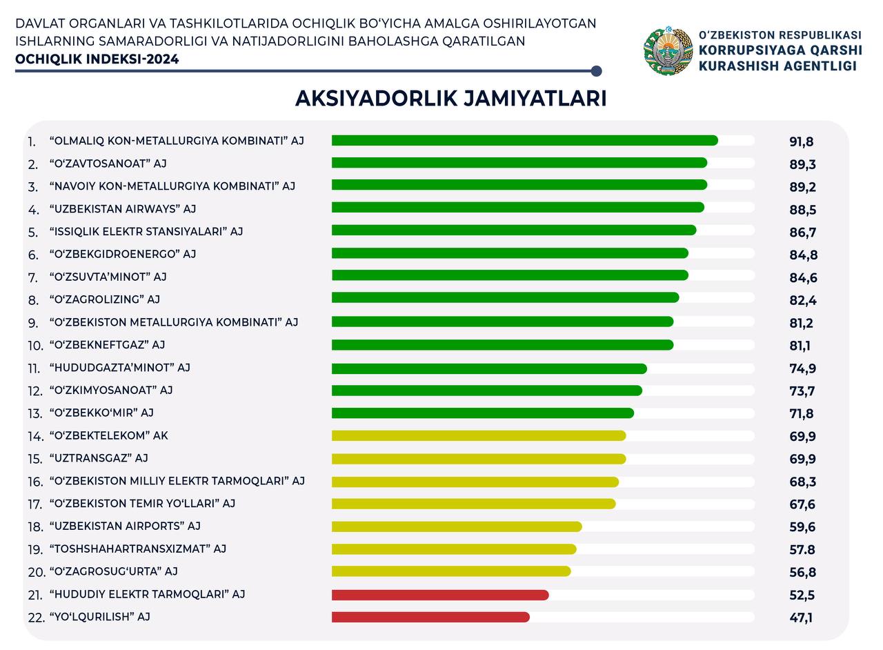 Yakuniy natijalarga ko‘ra, "Ochiqlik indeksi-2024" eng yuqori samaradorlik ko‘rsatkichlarini qayd etgan holda Olmaliq kon-metallurgiya kombinati 91,8 ball bilan Respublikada 1-o‘rinni egalladi.