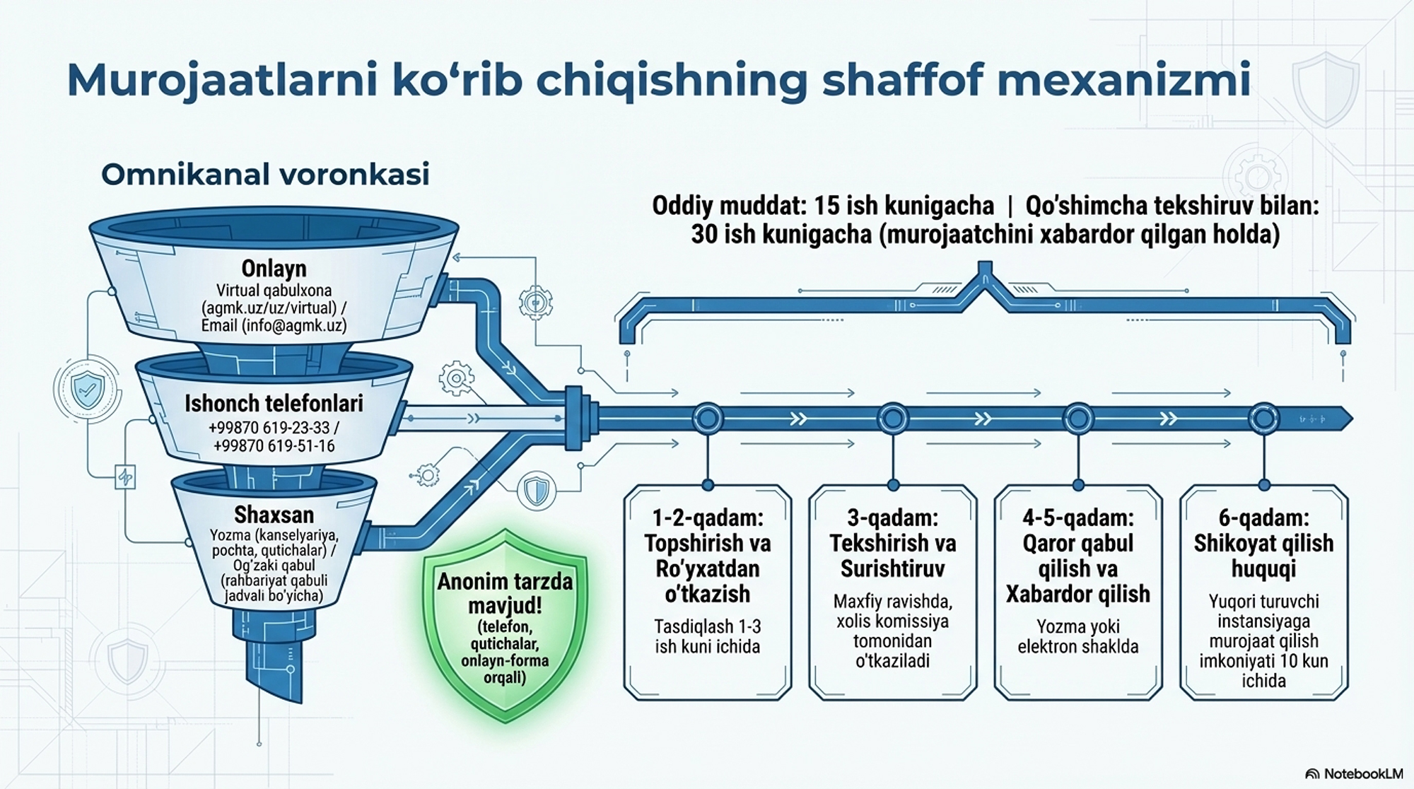 - Shikoyatlar va murojaatlar mехanizmi: Sizning ovozingiz biz uchun muhim! Muammo va takliflarni yetkazishning shaffof kanallari.