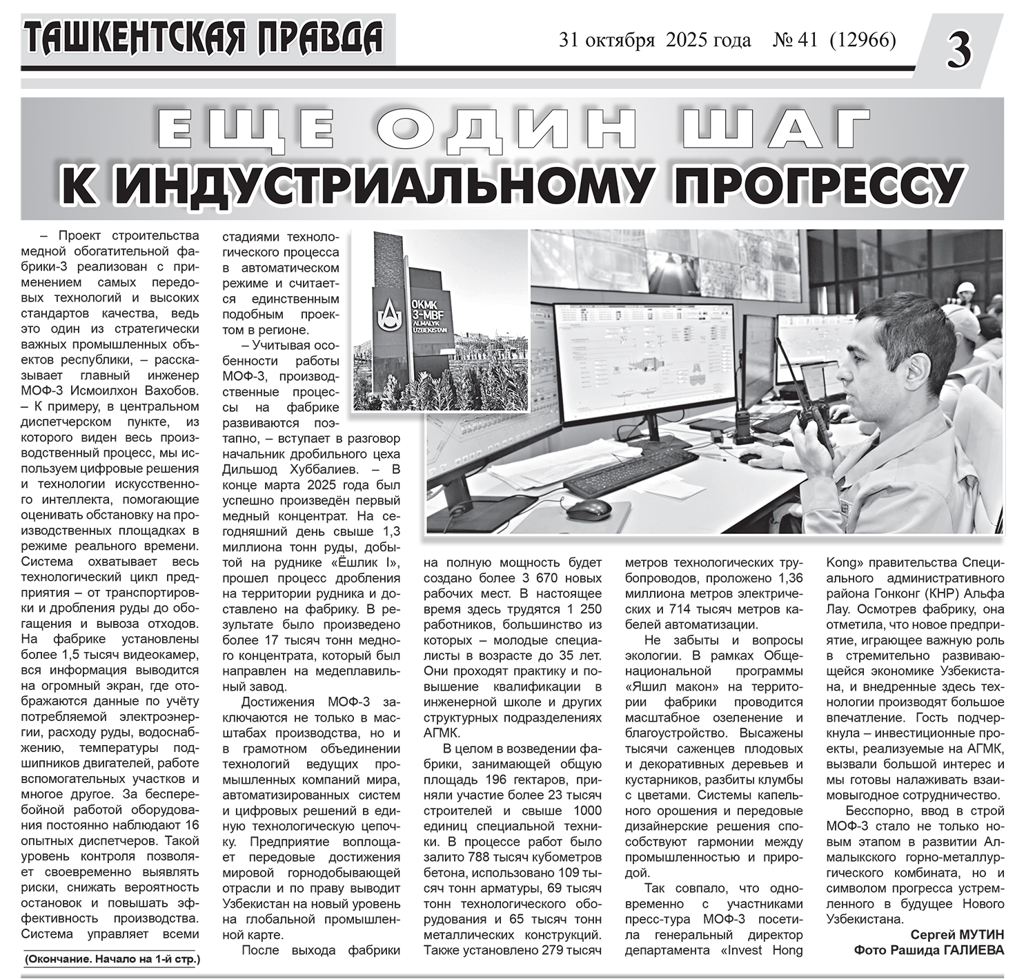 +998 71 619 23 33В газете «Ташкентская правда» (№41 от 31 октября 2025 года) опубликована статья «Ещё один шаг к индустриальному прогрессу».