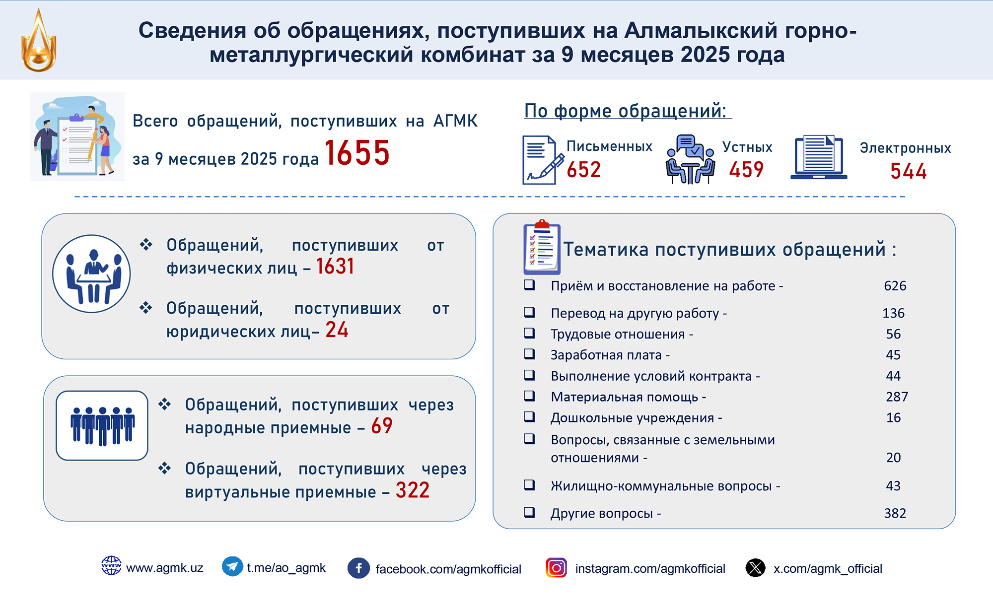+998 71 619 23 33Сведения об обращениях, поступивших на Алмалыкский горно-металлургический комбинат за 9 месяцев 2025 года.