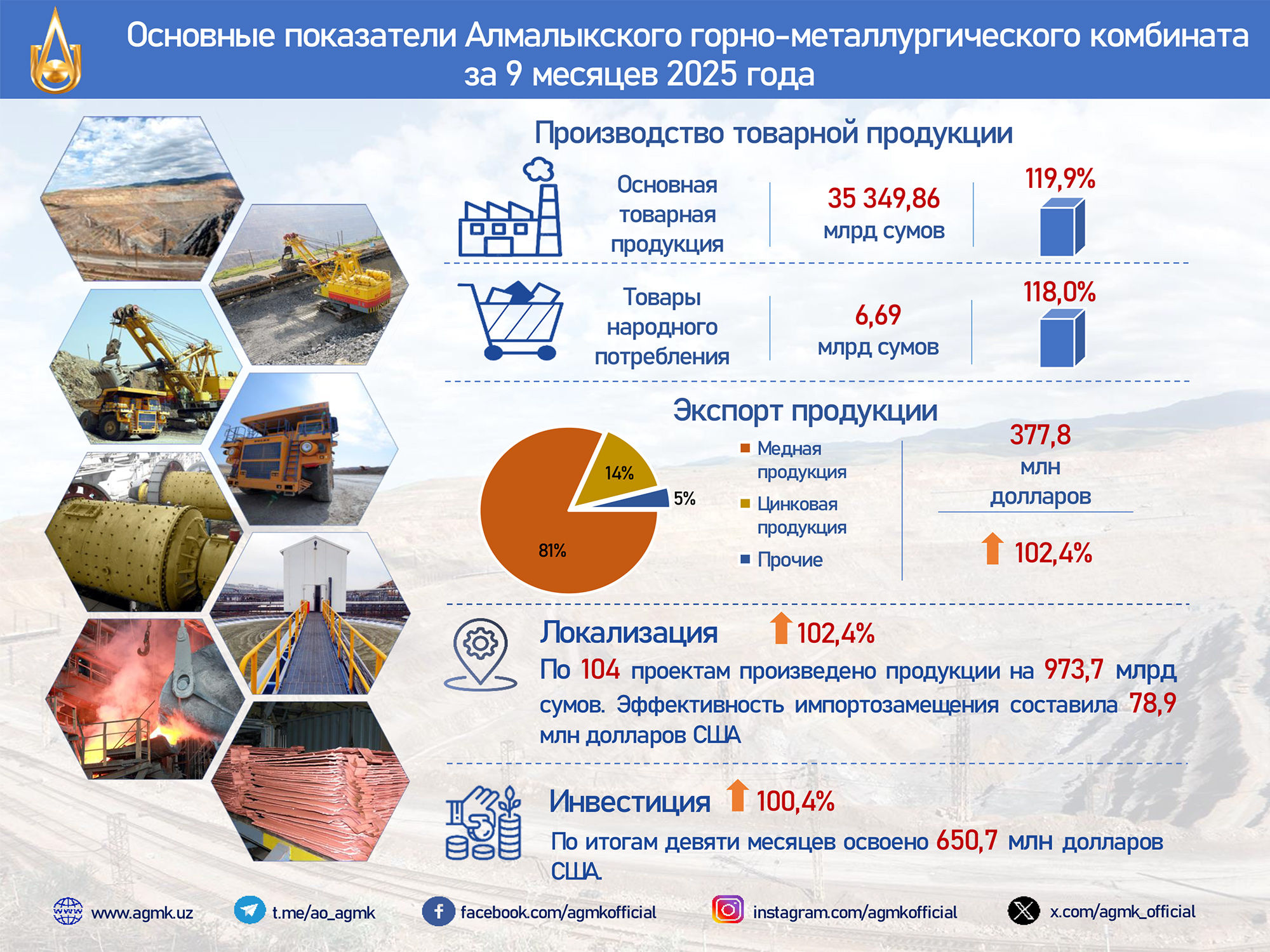 +998 71 619 23 33Выполняя важнейшие приоритеты программы социально-экономического развития коллектив АО «Алмалыкский ГМК» за 9 месяцев 2025 года обеспечил выпуск товарной продукции: