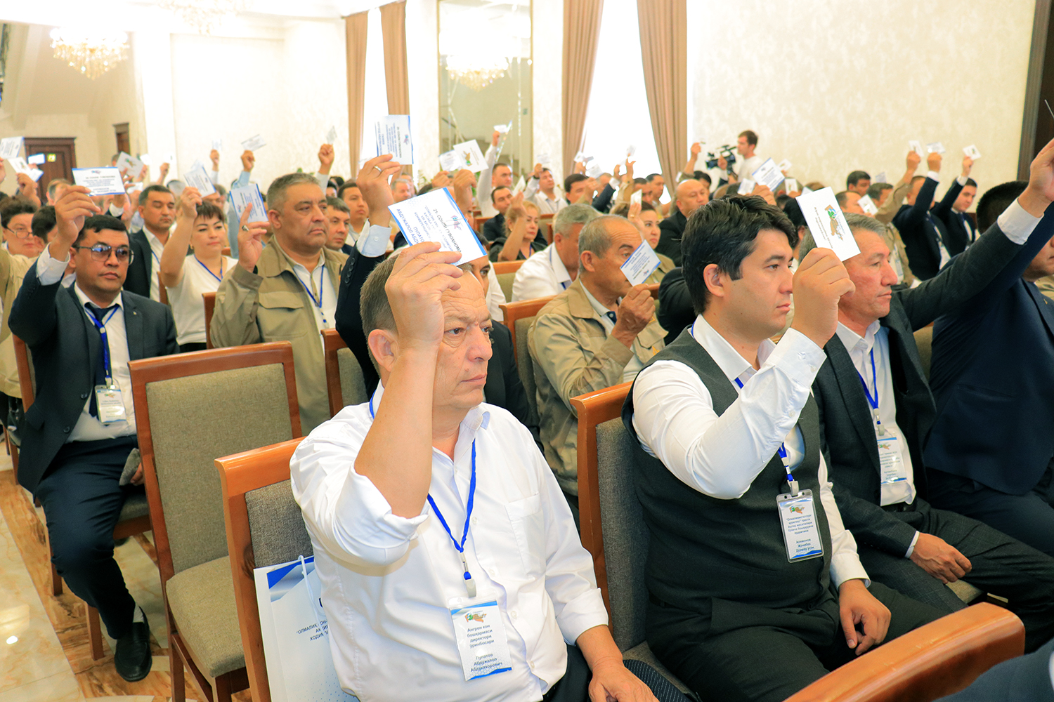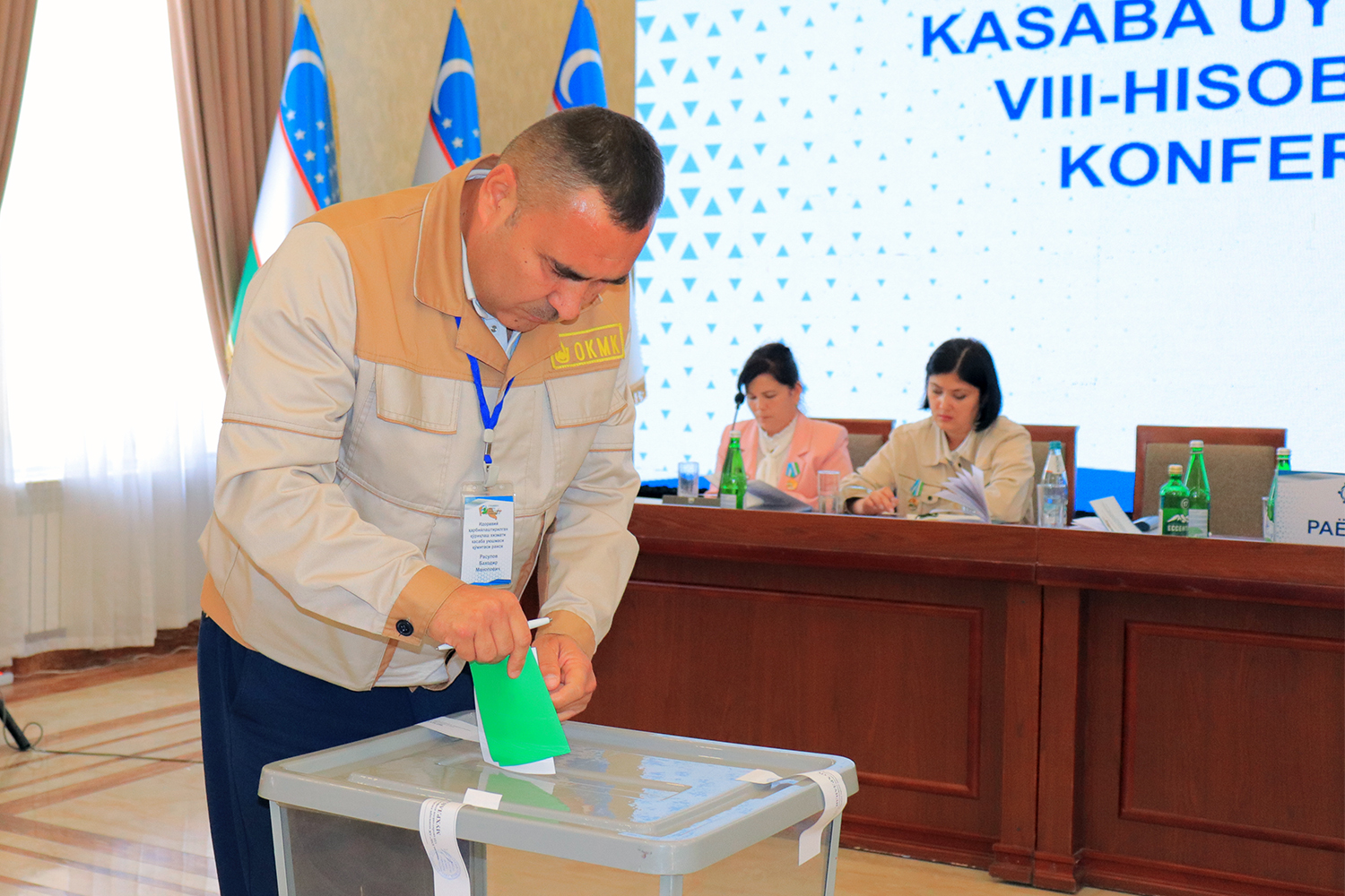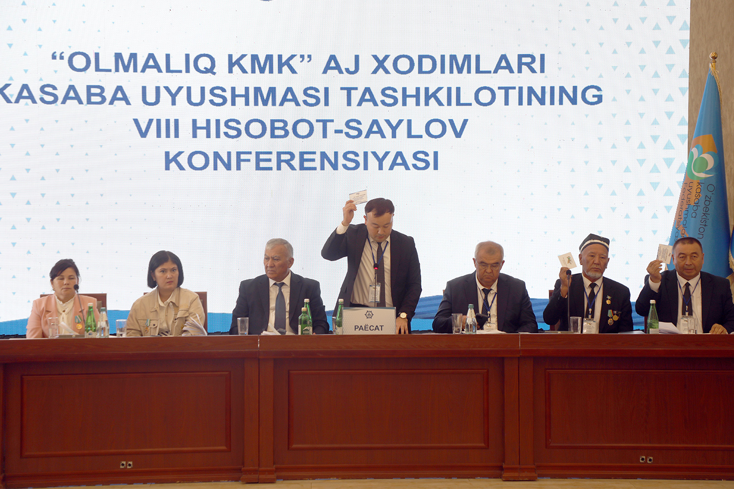 Согласно Положению о проведении отчетных выборов, организационные вопросы также были включены в повестку дня конференции. В целях обеспечения проведения выборов в этом году в соответствии с принципами прозрачности и справедливости, впервые в истории Федерации на основе новых подходов были проведены выборы руководителей профсоюзных организаций всех уровней, а также освобожденных от производственной работы председателей и заместителей председателей на альтернативной основе. От имени делегатов на пост председателя Совета профсоюза работников АГМК были предложены кандидатуры Фарогат Маткаримовой – председателя профкома УСО, Машраба Холикова - начальника УНПС, и Абдирашида Хайдарова. По итогам тайного голосования А. Хайдаров был переизбран на пост председателя совета 63 голосами, что составило 81%. На должность заместителя председателя также были выдвинуты 3 кандидатуры - Улугбек Артикбаев (председатель профкома УПЖТ), Омонкул Бекназаров (ранее занимавший должность заместителя председателя СПР АГМК) и Асибе Джураева (заместитель председателя профкома УТТ). Доверие было оказано Омонкулу Бекназарову, получившему 52 голоса (67%).
