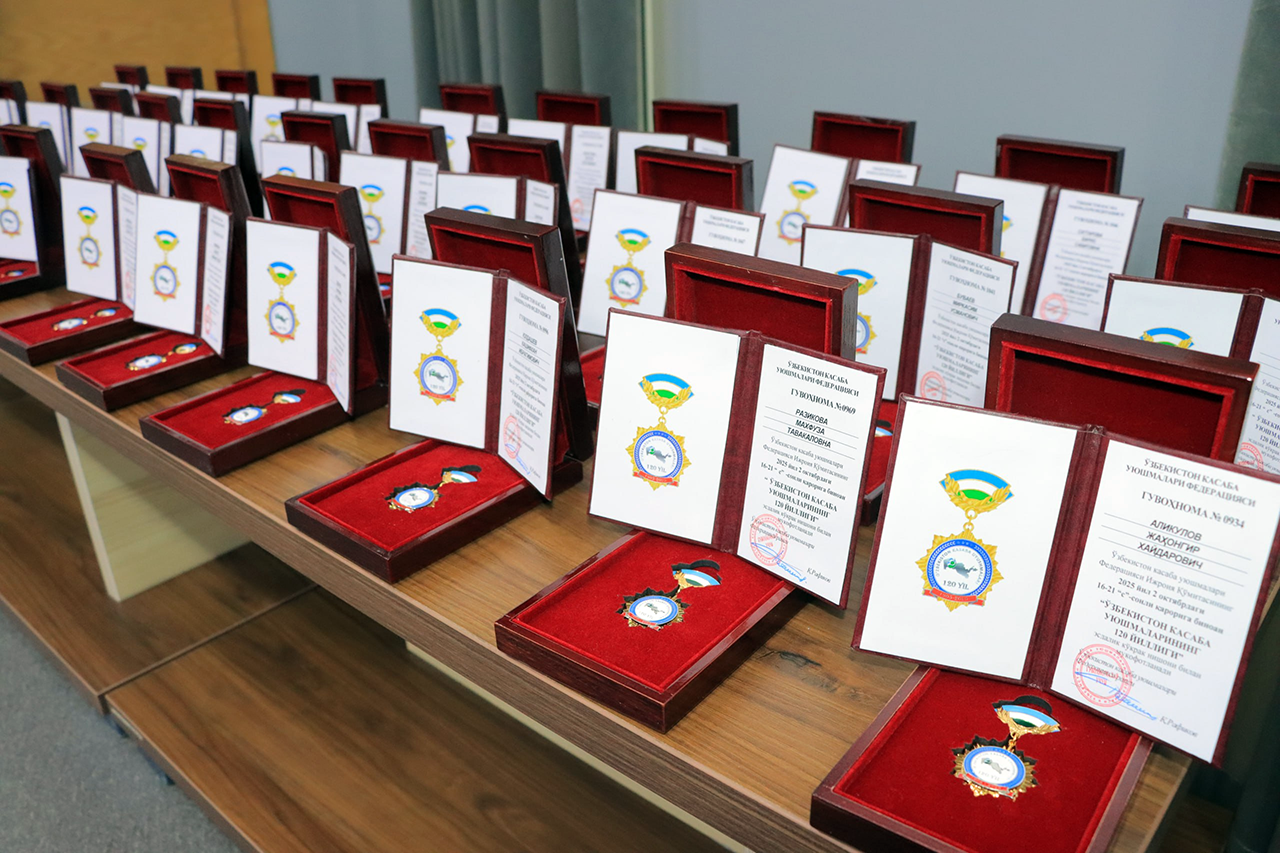 В рамках мероприятия 73 представителям профсоюзных организаций – председателям и активистам районных, городских и первичных профсоюзных комитетов предприятий и учреждений были торжественно вручены памятные нагрудные знаки «120 лет профсоюзному движению Узбекистана».