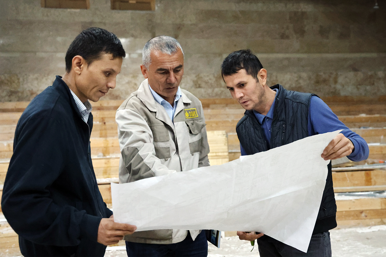 По информации начальника участка треста «Олмаликметаллургкурилиш» Сардора Исмаилова, на сегодняшний день 95% демонтажных работ уже завершено. В настоящее время ведётся штукатурка и монтажные работы, устанавливаются каркасы для крепления гипсокартонных панелей. Параллельно проводится подготовка фасадной части здания к облицовке травертином. Кровля полностью обновлена и покрыта мягким материалом.