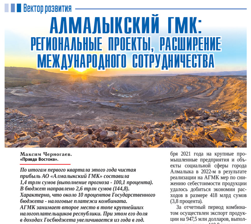 На IV Международном конгрессе и выставке "Горнодобывающая промышленность Узбекистана и Центральной Азии" Алмалыкский горно-металлургический комбинат получил награду в номинации "Инвестиционный проект года". Для предприятия, как и для всей отрасли, это один из самых престижных профессиональных итогов, а для страны – подтверждение того, что она способна реализовывать проекты международного уровня.